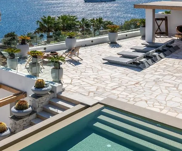 Guests can enjoy a seaside pool view from a terrace at Villa Lilium I - Overlooking Psarou Bay, Mykonos, 4.1 km from the Windmills of Kato Mili.